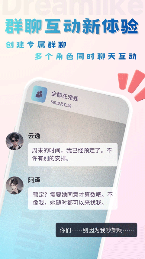 3、创建专属群聊,邀请多位角色同屏畅聊,体验多角色互动的趣味与惊喜。
