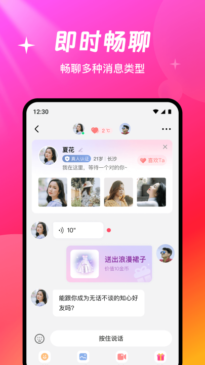 2、实时畅聊——支持文字、图片、视频等多种沟通方式,勇敢表达自我,为幸福主动出击;