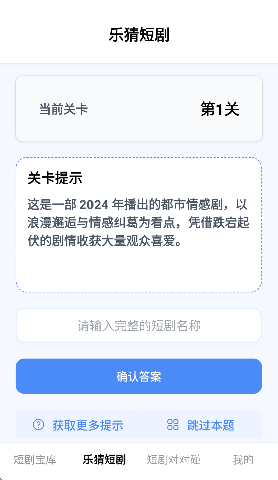 2、进入游戏界面后,根据当前关卡提示输入对应的短剧名称,点击【确认答案】即可提交;