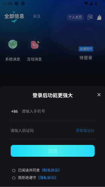 3、输入手机号和验证码即可成功登录