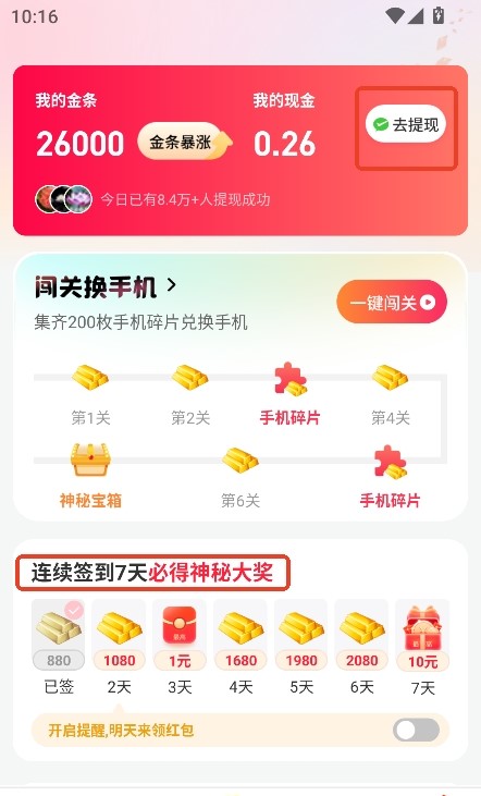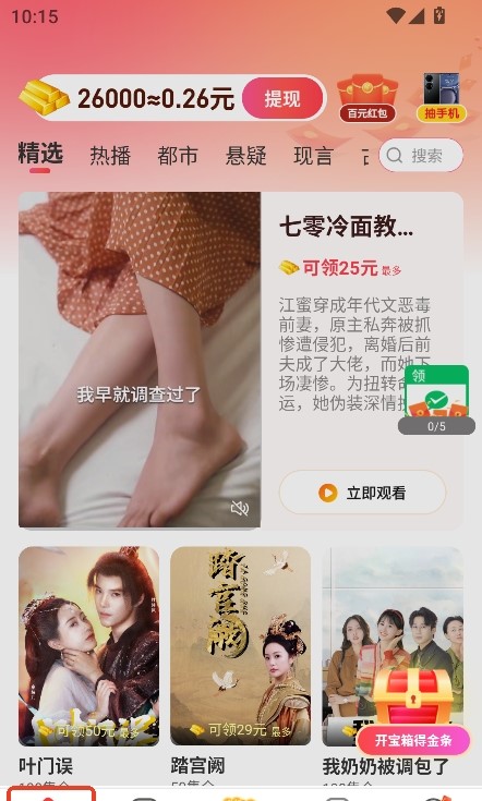 4、每天完成签到、闯关、观看时长、分享剧集等简单任务,即可累积金币或现金奖励,达到门槛后支持一键提现,边追剧边赚零花!