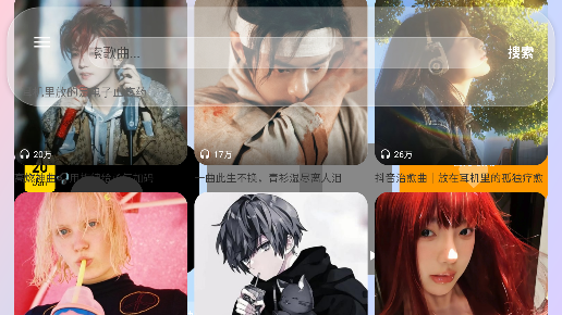 1、下载并打开听了么TV应用,进入主界面后,使用遥控器点击顶部的【搜索框】,输入您想听的歌曲名称或歌手名字。