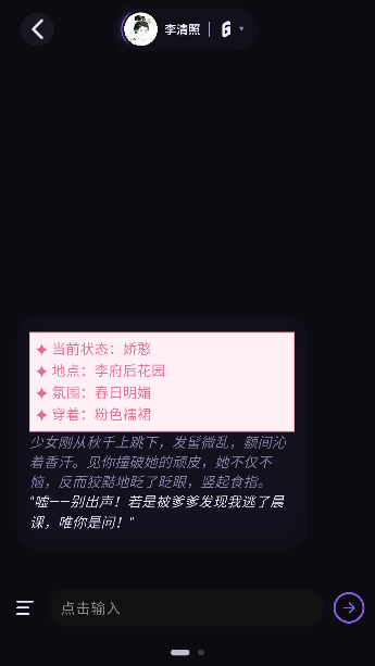 4、进入聊天界面后,AI会根据角色设定主动发起互动。你可以像和朋友聊天一样自由回复,每一次回应都可能影响故事走向,解锁全新剧情分支!