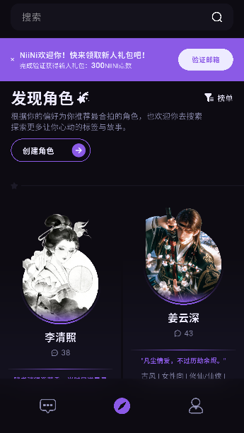 3、注册成功后,自动跳转至主界面,你可以立即浏览AI角色库,选择心仪角色,开启专属剧情对话!
