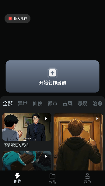 1、打开ai漫剧创作App,点击首页醒目的【开始创作漫剧】按钮,立即进入创作中心。