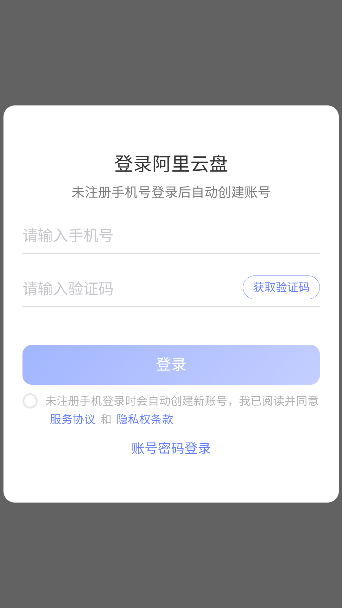 2、在登录界面点击【立即登录】,输入您的阿里云盘绑定手机号,通过短信验证码即可完成身份验证,无需复杂密码操作。