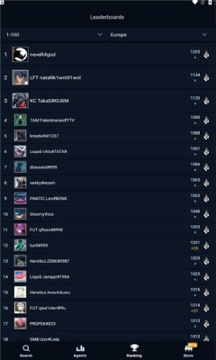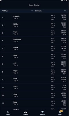 5、支持查看任意地图或排行榜中每位特工的全球统计数据,包括胜率、KDA、爆头率等关键指标,精准评估角色表现与自身水平。