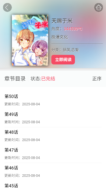 悦耽漫画每部漫画均配有清晰封面、完整简介、标签分类与用户评分,阅读前先“试读”,选得更准、看得更爽;界面清爽无干扰,轻点封面即可进入阅读,支持横竖屏切换、自动翻页、夜间模式等贴心功能;从经典完结到连载更新,从大众爆款到小众佳作,内容持续上新,告别“漫荒”焦虑。在悦耽漫画,每一次滑动都是惊喜,每一帧画面都值得沉浸。现在就下载悦耽漫画App,开启你的高清、流畅、无广告的追漫之旅吧!