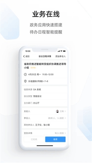 郑政钉无论是日常通知传达、考勤打卡、请假申请、公文审批,还是OA流程处理、任务分派与进度追踪,所有核心办公功能均集成于掌上终端,实现“指尖办公、随时响应”。系统严格遵循政务信息安全规范,确保数据流转安全可控;同时依托智能提醒、流程自动化与跨部门协同机制,显著提升各层级、各部门的办事效率与执行力。不仅是一款工具,更是推动政府治理能力现代化的重要支撑。