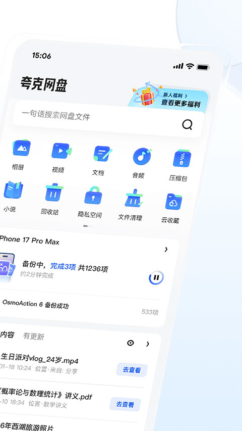 1、下载《夸克网盘》独立版App,新用户注册并登录后,立即赠送10GB免费存储空间。