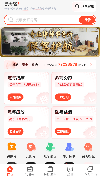 号大咖支持玩家间自主发布、议价、交易,覆盖《原神》《王者荣耀》《和平精英》《英雄联盟》《DNF》等数百款热门游戏账号。大额账号支持分期付款,降低入手门槛;用游戏账号快速申请短期资金周转,灵活应急;无论是买号、卖号,还是融资、变现,这里都是玩家值得信赖的选择。立即下载号大咖App,开启安全高效的账号交易新体验!