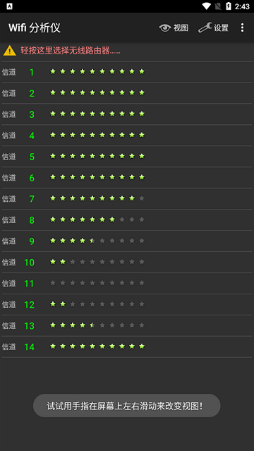 WiFi Analyzer自动扫描周围所有WiFi网络,清晰展示各信道的使用密度与信号强度,帮助你快速识别拥堵频段。基于扫描结果,系统会自动推荐最空闲、干扰最小的WiFi信道,只需将路由器切换至该信道,即可有效减少信号冲突,提升网络性能。无需额外硬件,只需打开WiFi Analyzer,你的安卓设备即刻化身为一台便携式网络诊断工具,立即下载,开启高效、流畅的无线网络新体验!