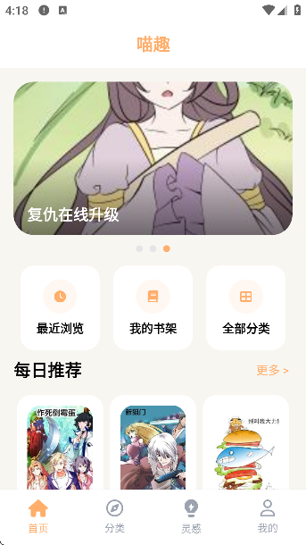 1、打开 喵趣动漫最新版,进入首页即可浏览海量漫画及每日精选推荐;