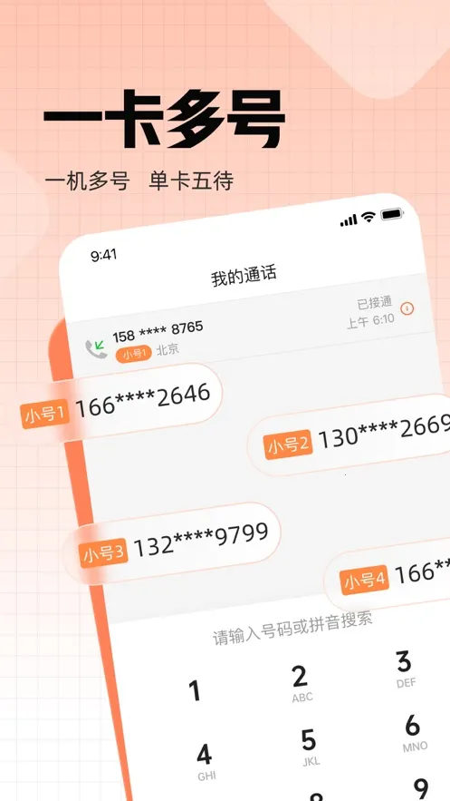 1. 便捷多号:一个手机可拥有多个号码,无需换卡换号,同时待机,满足多种身份人群对多个手机号码的需求,适用于商务往来、网络注册、快递物流等多种场景。