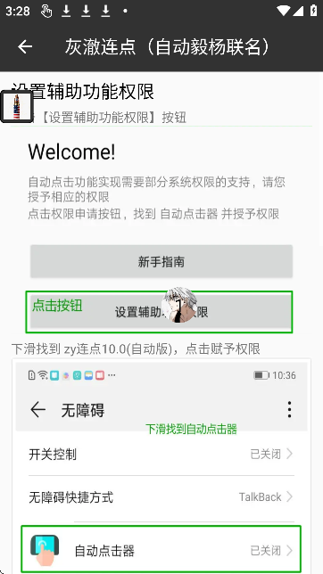 2、请依次启用所需权限(如无障碍服务、悬浮窗显示等),以确保自动点击功能正常运行。