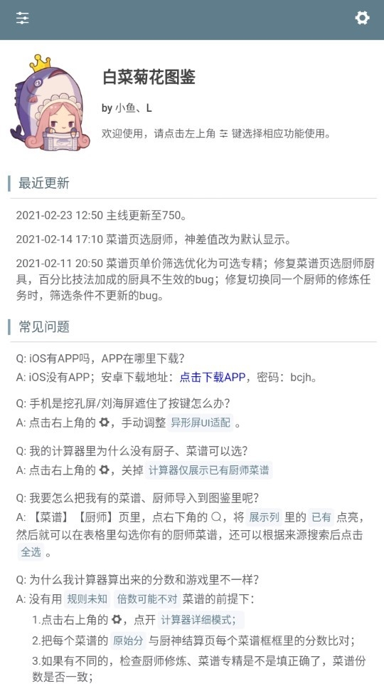 白菜菊花计算器是游戏辅助工具,有详尽图鉴系统。每周五厨神大赛可自动匹配最佳阵容,输入贵客名称能查偏爱料理。还能保存记录,界面清晰,有攻略参考,支持数据导入,方便实用。