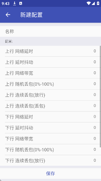 2、点击「添加配置」,根据需要设置网络参数(如延迟、丢包率、带宽等),配置完成后记得点击「保存」。